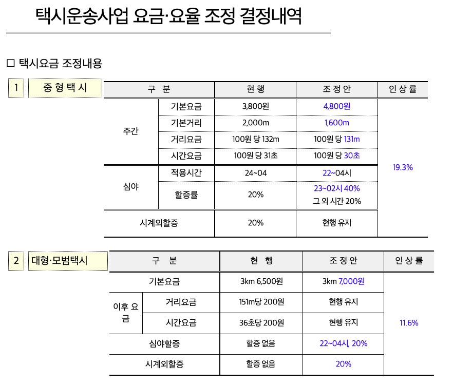 아래는 서울시청에서 발표한 택시운송사업 요금 조정 결정내역입니다.