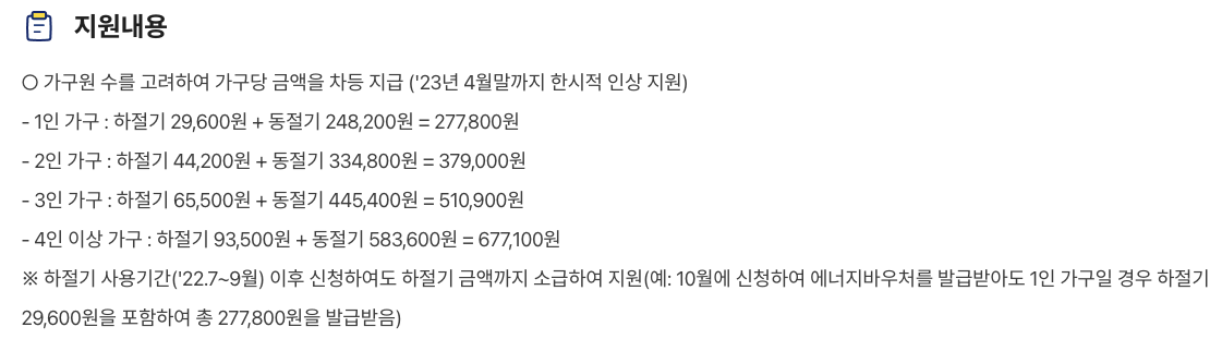 가구원수에 따라 277,800원부터 최대 677,100원까지 지급 되는데요. 이 금액은, 23년 4월 말까지만 한시적으로 인상된 금액이니, 신청 대상자이신분들은 하루빨리 신청하시는게 좋겠습니다.